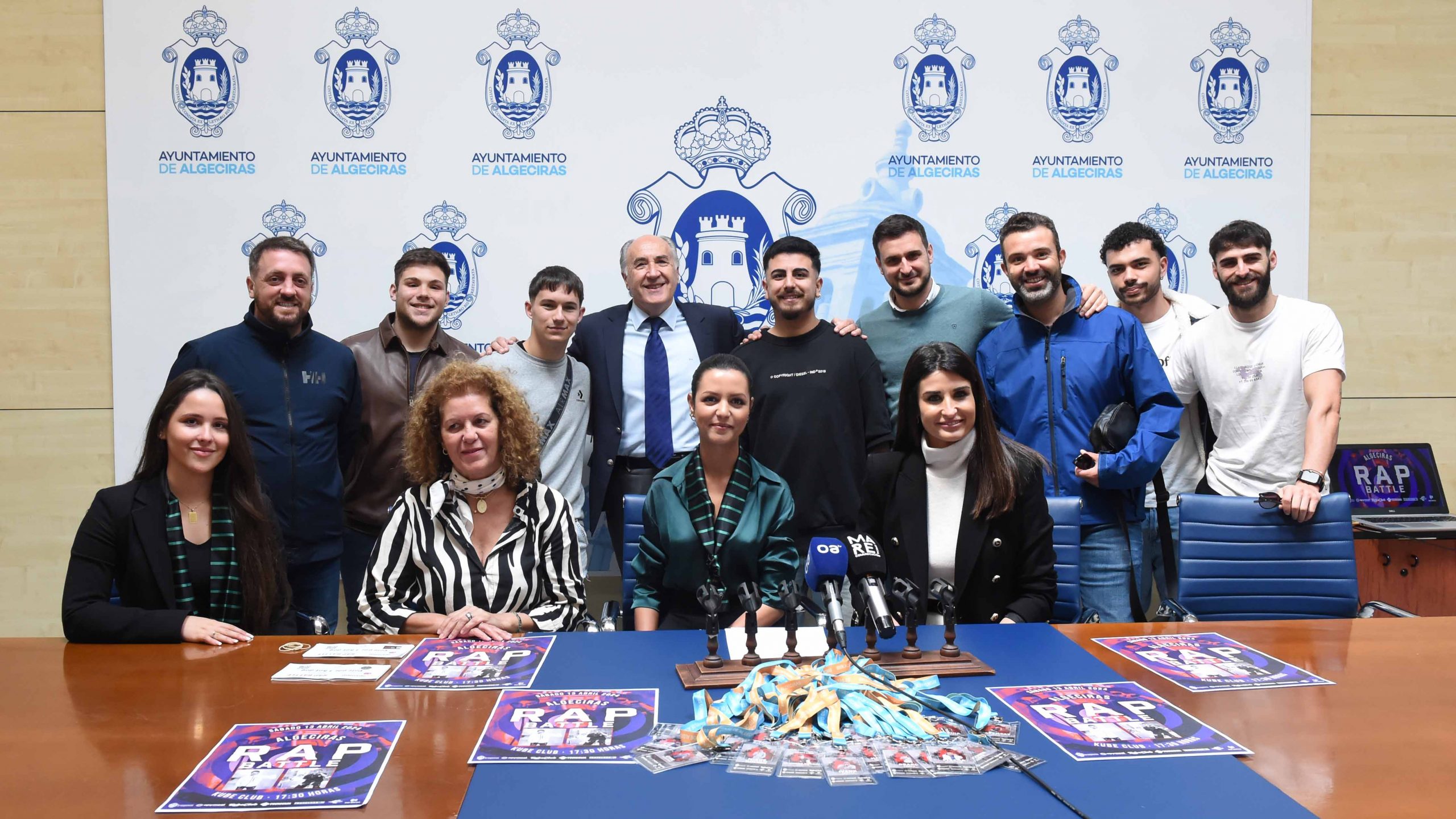 El alcalde de Algeciras, José Ignacio Landaluce, junto al concejal delegado de Juventud, Francisco Javier Arango, a Carlos Bejarano, promotor del evento, y miembros de las entidades colaboradoras, ha presentado este mediodía en el Ayuntamiento la segunda edición de «Batalla de Rap», evento dedicado al fomento de esta parcela de la cultura urbana y que se celebrará el sábado 13, a partir de las cinco y media de la tarde en la discoteca Kube.