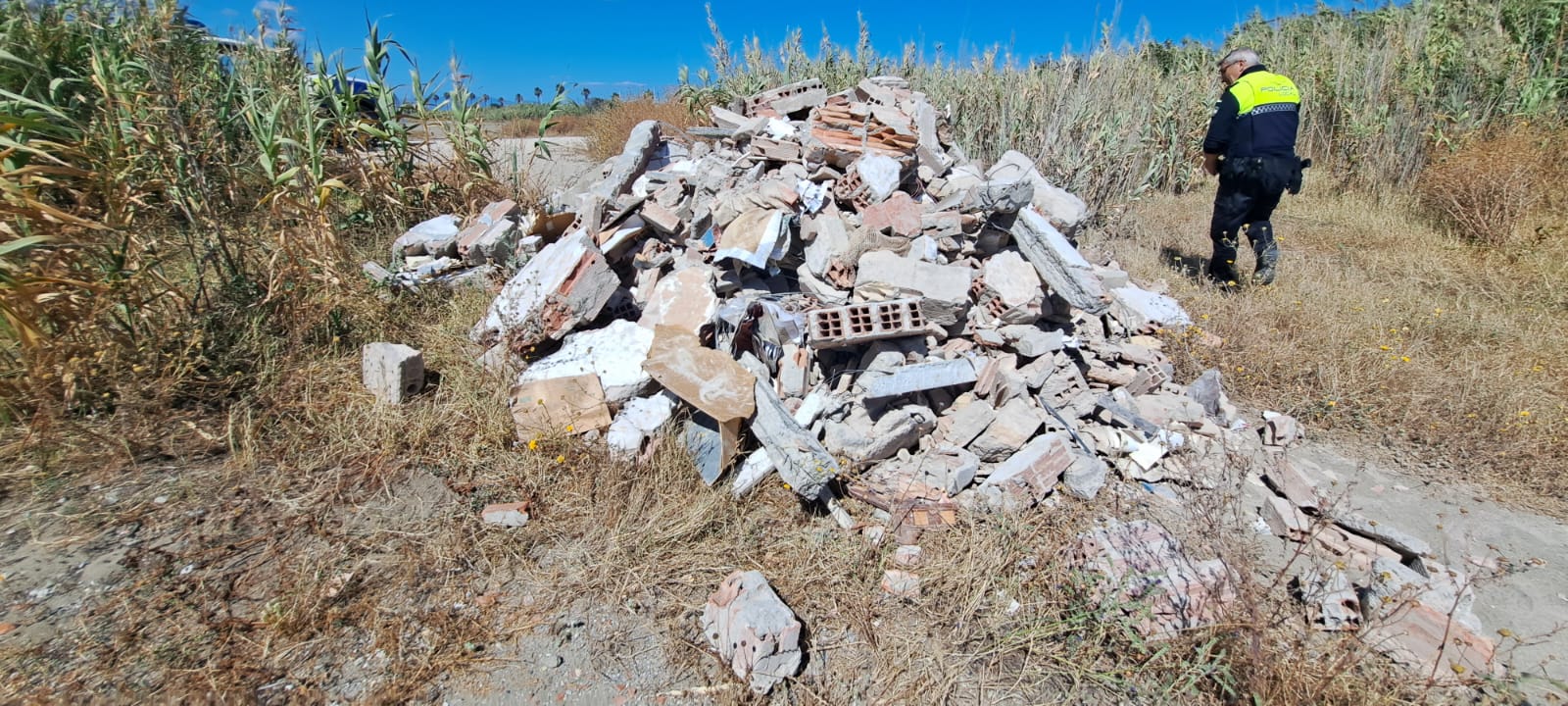 Una patrulla policial se desplazó hasta el lugar para identificar a los responsables, comprobando la existencia del vertido que, por los materiales utilizados, parecía provenir de un derribo de construcción antigua, apreciándose ladrillos toscos, gavillas de acero lisas y algunas facturas deterioradas pertenecientes a un establecimiento comercial.