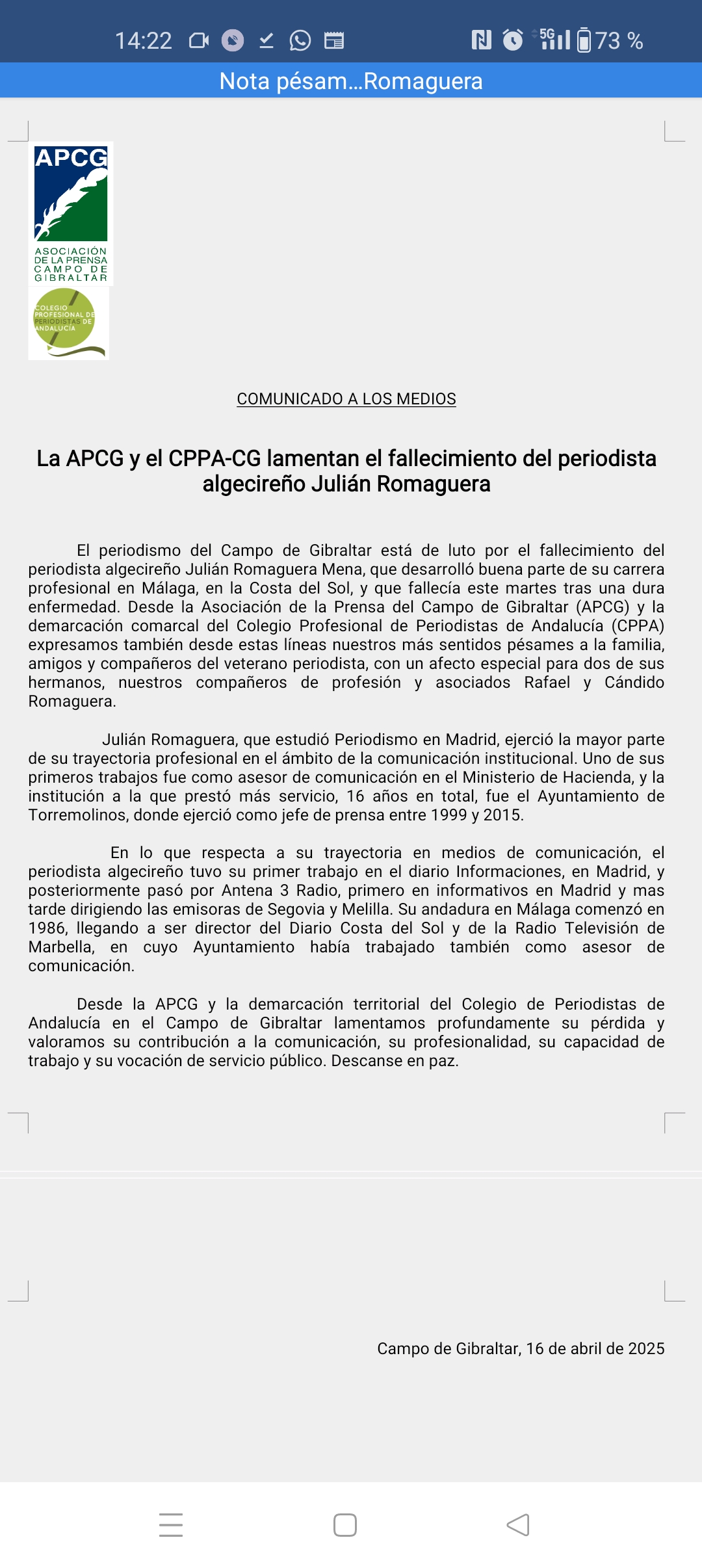 *La APCG y el CPPA-CG ha emitido un comunicado en el que lamentan el fallecimiento del periodista algecireño Julián Romaguera